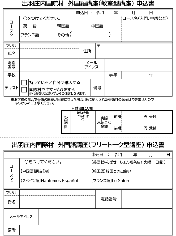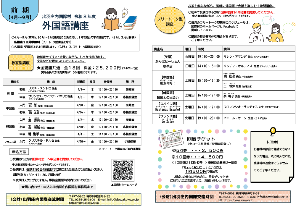 出羽庄内国際村では国際理解事業の一環として外国語講座を行っております。 英語、中国語、韓国語、スペイン語、フランス語を各国出身の先生方から学んでいます。教科書やプリントを使いながら、文法などをしっかり学ぶ【教室型講座】と、お茶を飲みながら、気軽に会話を楽しむ【フリートーク型講座】があります。